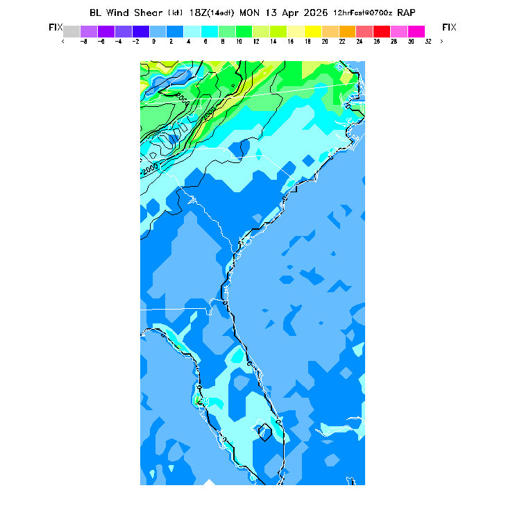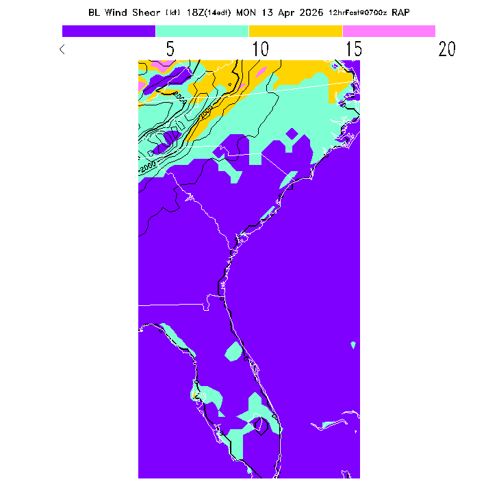 The magnitude of the vector wind difference between the top and bottom of the BL.  Note that this represents vertical wind shear and does not indicate "shear lines" (which are horizontal changes of wind speed/direction).  MoreInfo