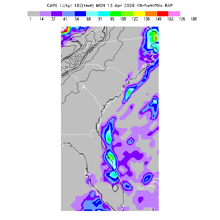 Convective Available Potential Energy indicates the atmospheric stability affecting deep convective cloud formation above the BL.  A higher value indicates greater potential instability, larger updraft velocities within deep convective clouds, and greater potential for thunderstorm development (since a trigger is needed to release that potential).  Note that thunderstorms may develop in regions of high CAPE and then get transported downwind to regions of lower CAPE.  Also, locations where both convergence and CAPE values are high can be subject to explosive thunderstorm development.   MoreInfo
