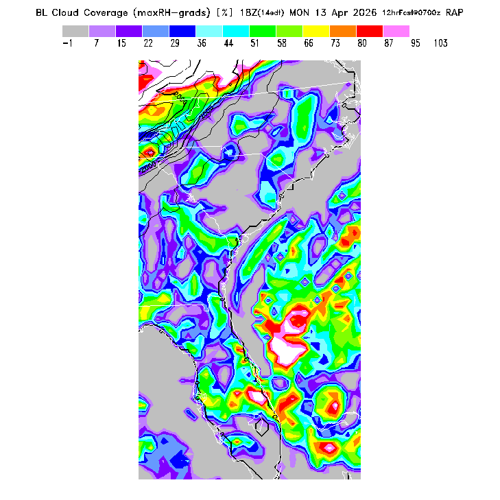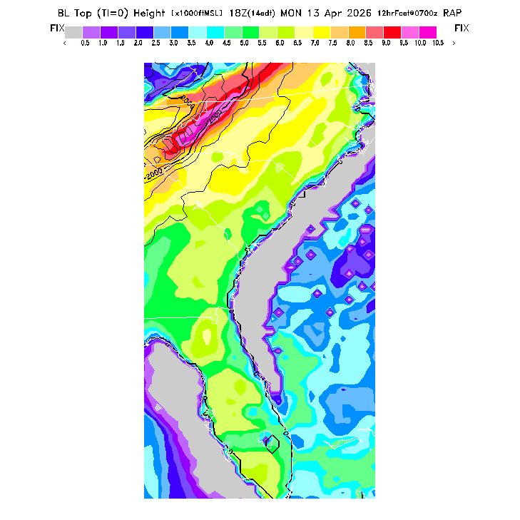 BLIPMAPs predict thermal soaring conditions resulting from surface heating of the Boundary Layer (BL), the scientific term for the turbulent atmospheric region mixed by surface-based thermals (so thermal tops occur at the top of the BL).  The BLIPMAP program post-processes numerical weather model predictions to provide parameters suited to the needs of soaring pilots and presents them in graphical format, as in this sample BLIPMAP.  Relative differences, both in location and in time, are expected to be more reliable indicators of soaring differences than are the precise numerical values.  BASIC thermal forecast parameters gives a short list of the parameters most important for thermal soaring.