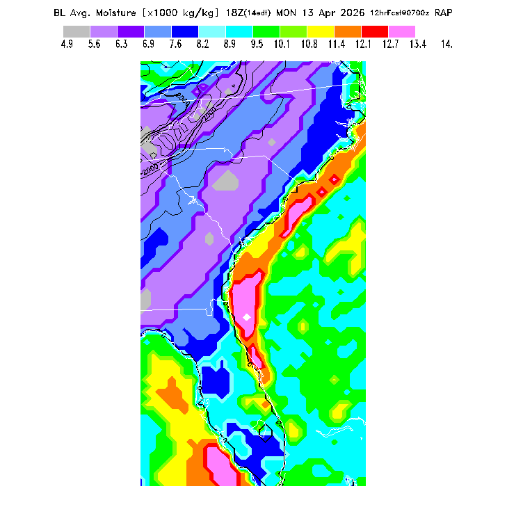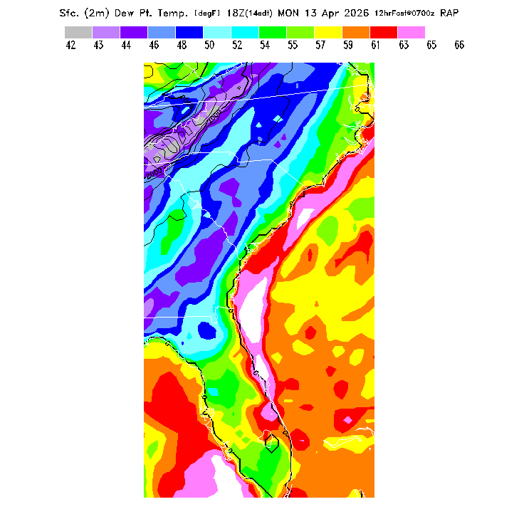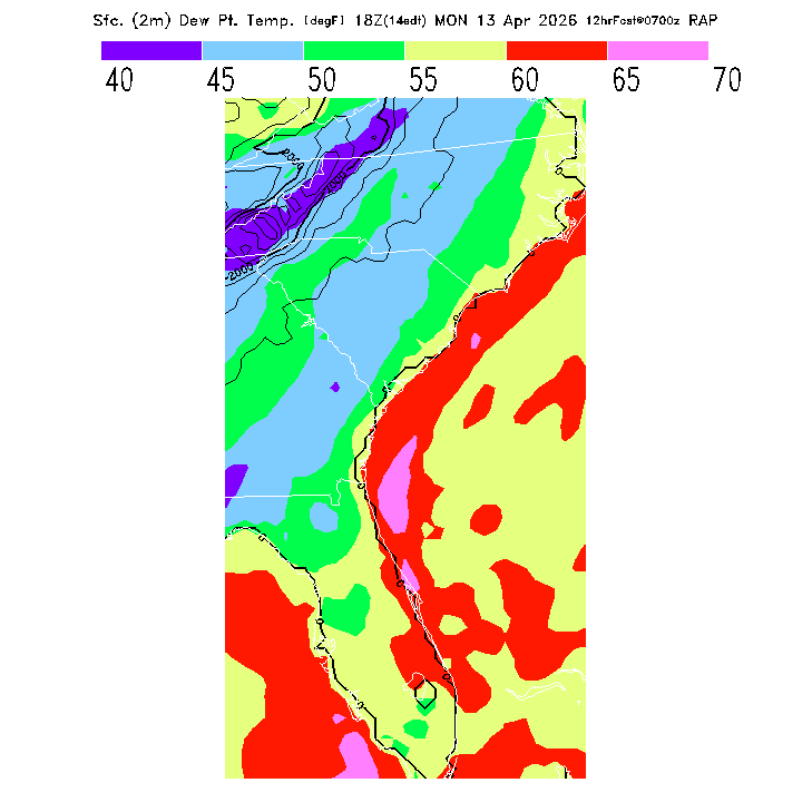 This model-predicted surface dew point temperature can be compared to the actual dew point temperature at 2m during the day to evaluate the accuracy of model moisture predictions.  MoreInfo