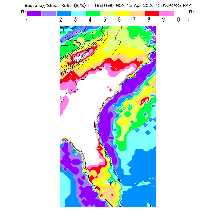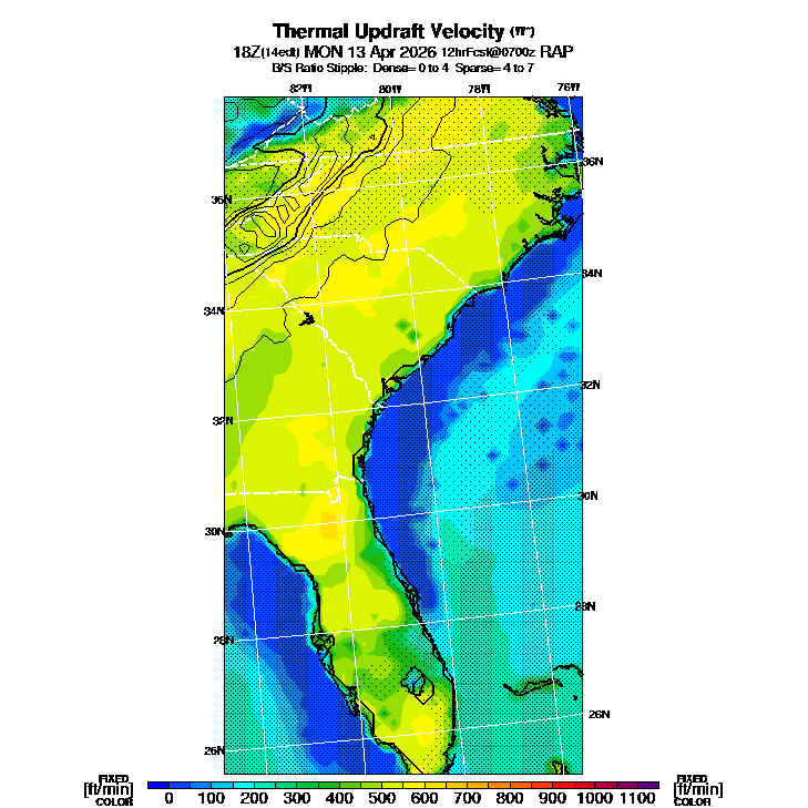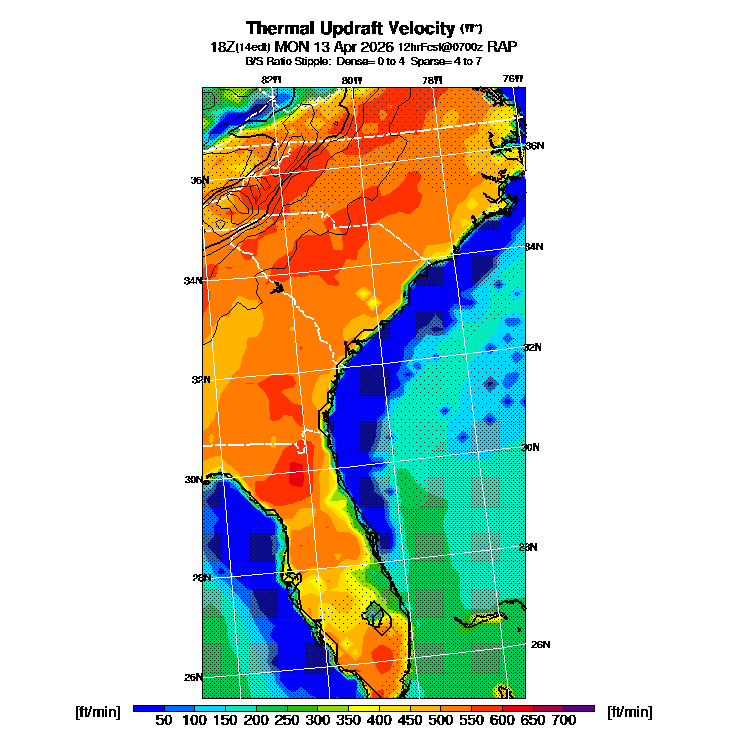 B/S Ratio stippling (dense=0-4 sparse=4-7) overlays Thermal Updraft Velocity contours to indicate where strong thermals can be broken by vertical wind shear.  See "Thermal Updraft Velocity" and "Buoyancy/Shear Ratio" parameter descriptions below for more information.