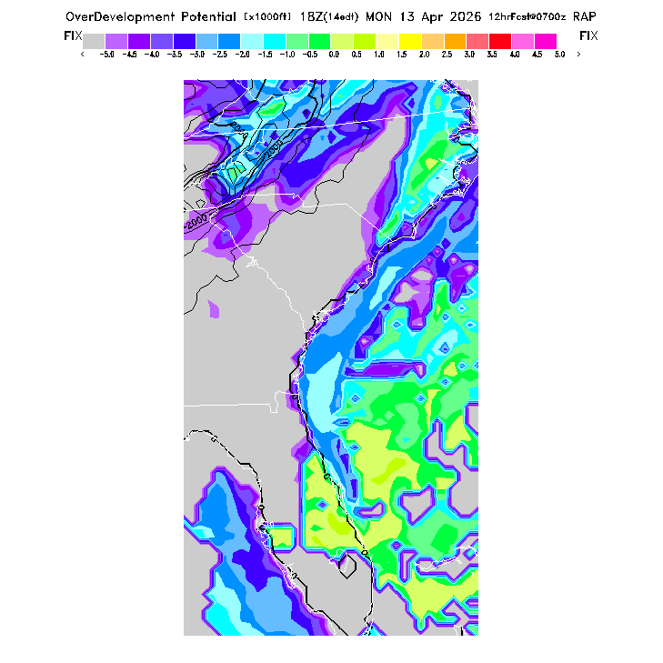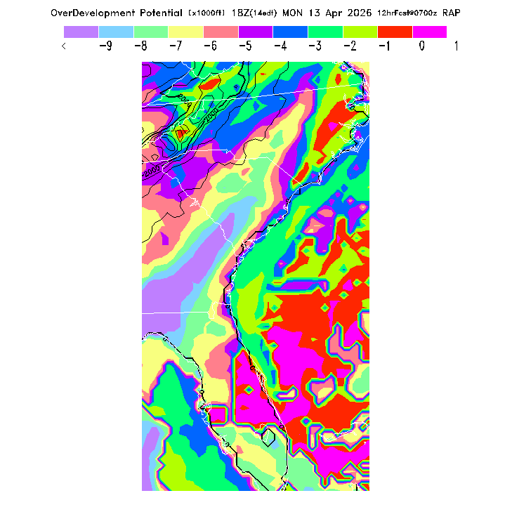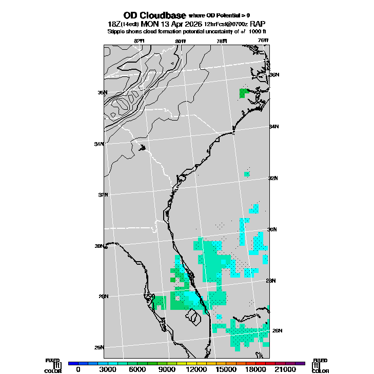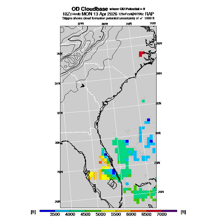 OvercastDevelopment Cloudbase Cloudbase contours are plotted only where that cloudbase is theoretically expected.  See "OvercastDevelopment Potential" and "OvercastDevelopment Cloudbase" parameter descriptions below for more information.  This composite is useful only for locations where the actual potential threshold for OD cloud production agrees with the theoretically-predicted value of zero.