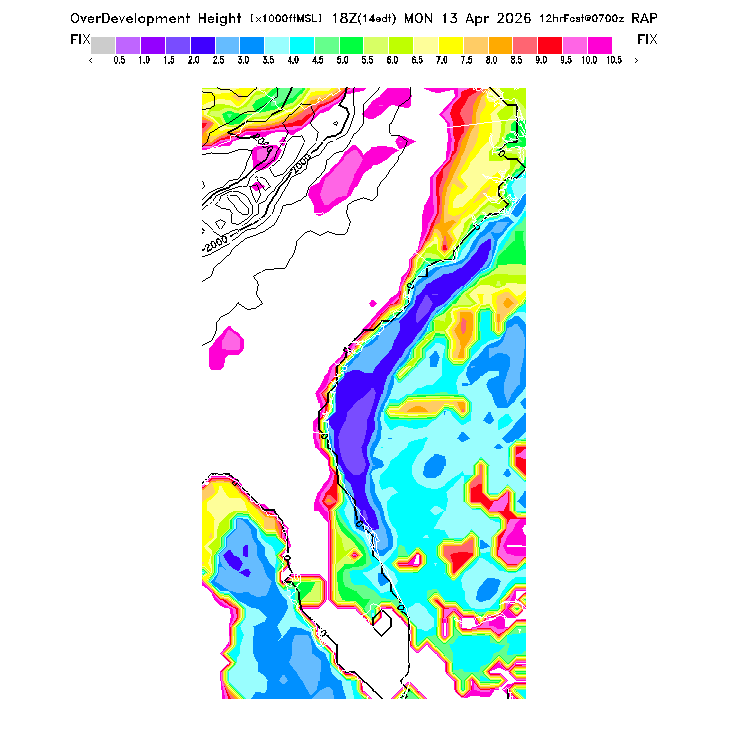 This evaluates the potential for extensive cloud formation (OvercastDevelopment) at the BL top, being the height difference between the BL CL (see below) and the BL top.  Extensive clouds and likely OvercastDevelopment are predicted when the parameter is positive, with OvercastDevelopment being increasingly more likely with higher positive values.  OvercastDevelopment can also occur with negative values if the air is lifted up the indicated vertical distance by flow up a small-scale ridge not resolved by the model's smoothed topography.  [This parameter is truncated at -10,000 for plotting.]   MoreInfo