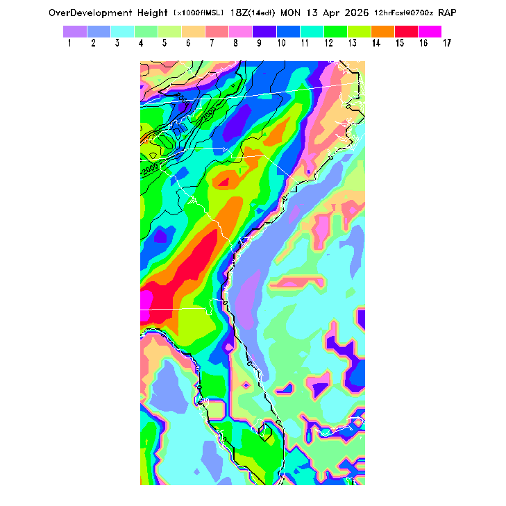 Height of the average dry thermal tops, or Thermal Index TI=0 height.  Over flat terrain maximum thermalling heights will be lower due to the glider descent rate and other factors.  However, thermal tops will be higher over small-scale topography not resolved by the model and some pilots have reported that in elevated terrain the heights they can reach over local terrain features correspond better with the TI=0 height than with Hcrit.  In the presence of clouds the thermal top will increase, but the maximum thermalling height will then be limited by the cloud base (see the "Cloud prediction parameters" section below).  [This parameter is truncated at 22,000 for plotting.]   MoreInfo
