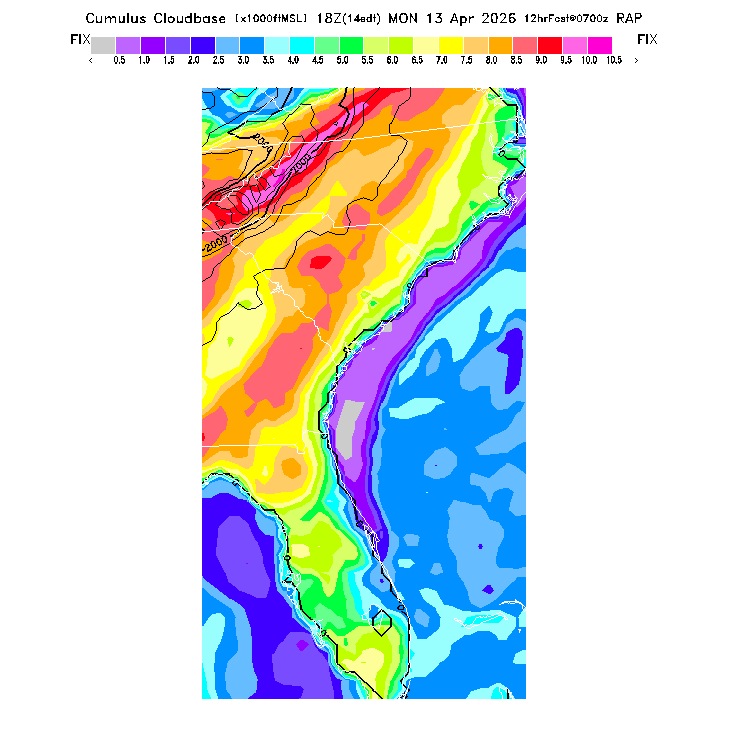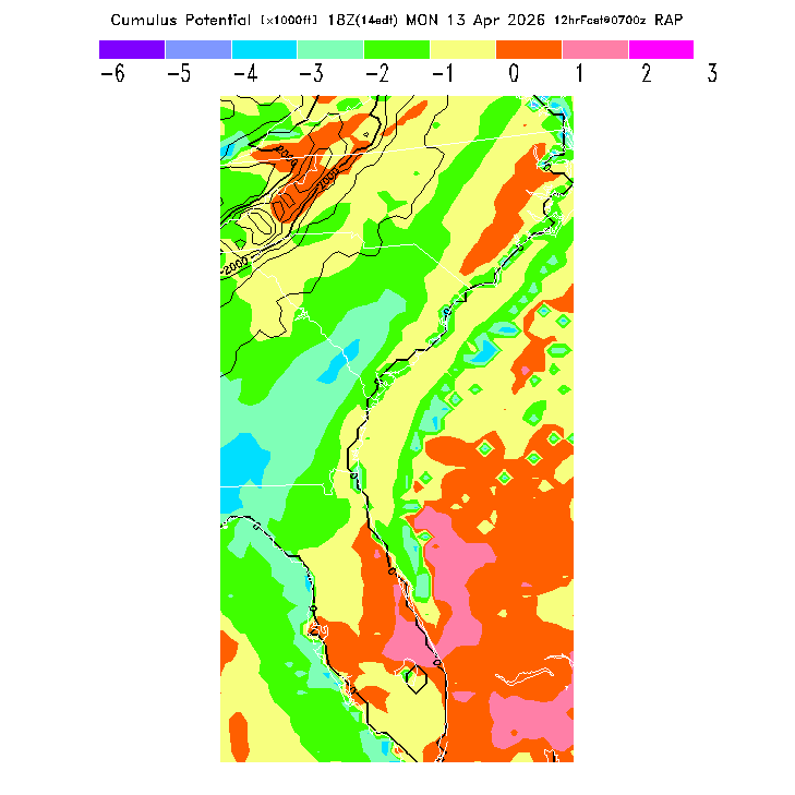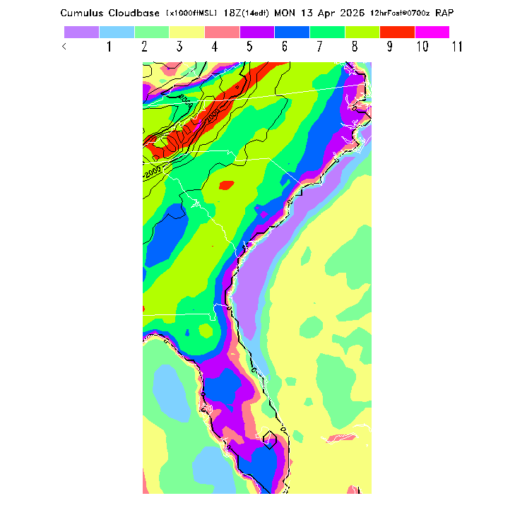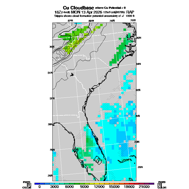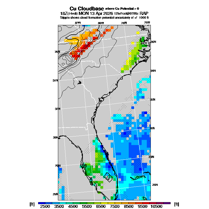 Cu Cloudbase Cloudbase contours are plotted only where that cloudbase is theoretically expected.  See "Cumulus Potential" and "Cumulus Cloudbase" parameter descriptions below for more information.  This composite is useful only for locations where the actual potential threshold for cumulus cloud production agrees with the theoretically-predicted value of zero.