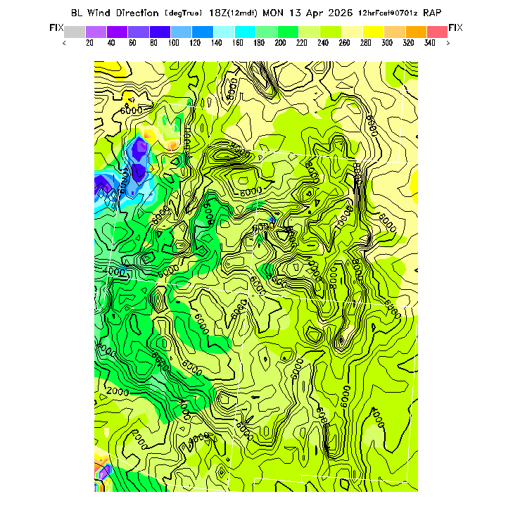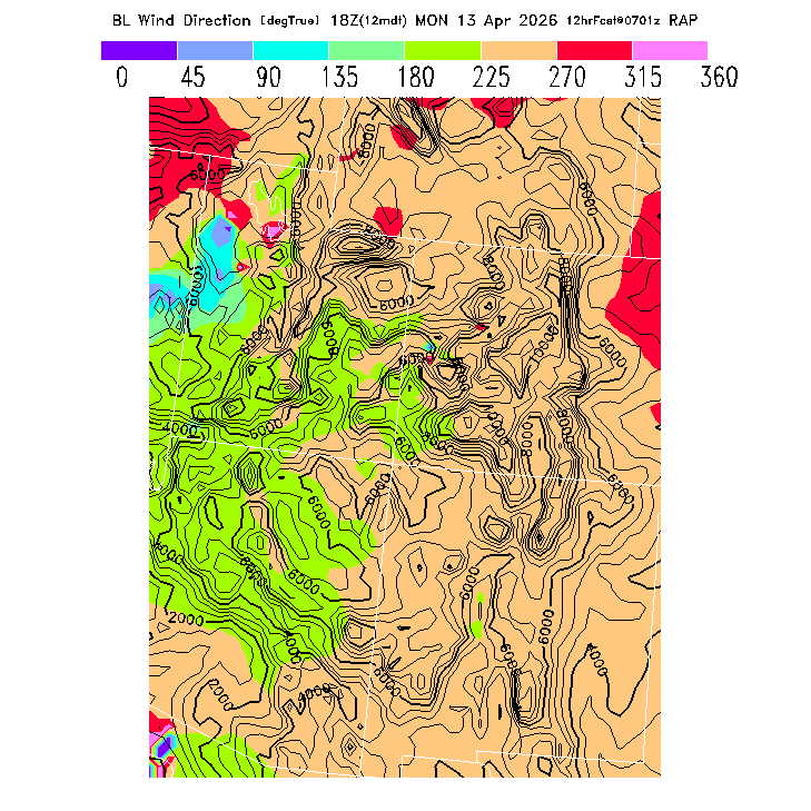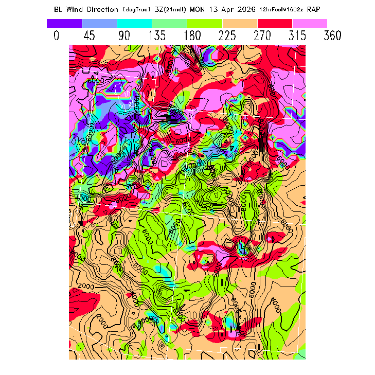 The direction of the vector-averaged wind in the BL.  This prediction can be misleading if there is a large change in wind direction through the BL (for a complex wind profile, any single number is not an adequate descriptor!).  Note that there will be a abrupt artificial gradient at the "cross-over" between 0 and 360 degrees.  MoreInfo
