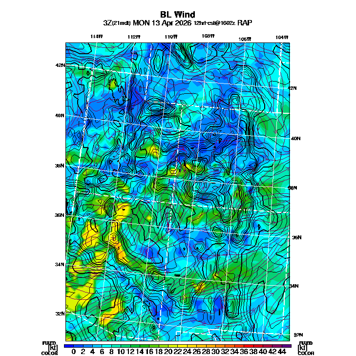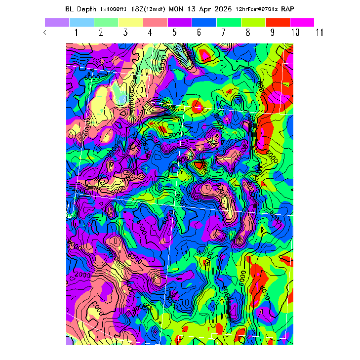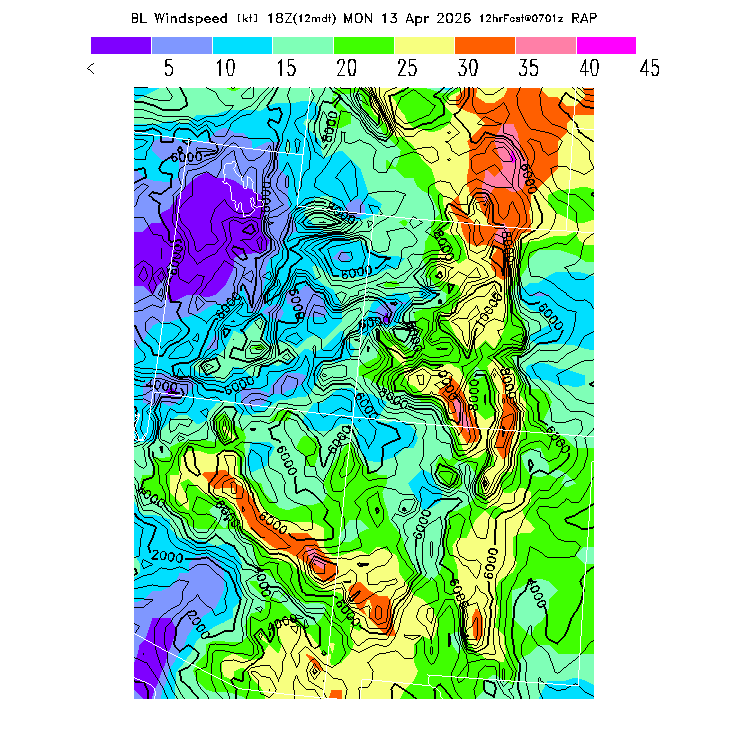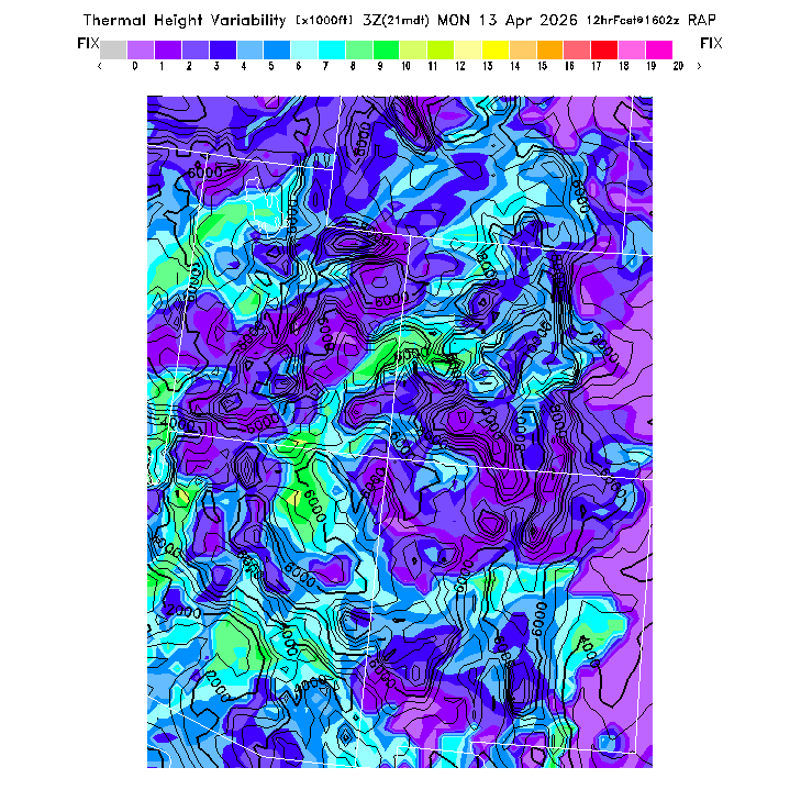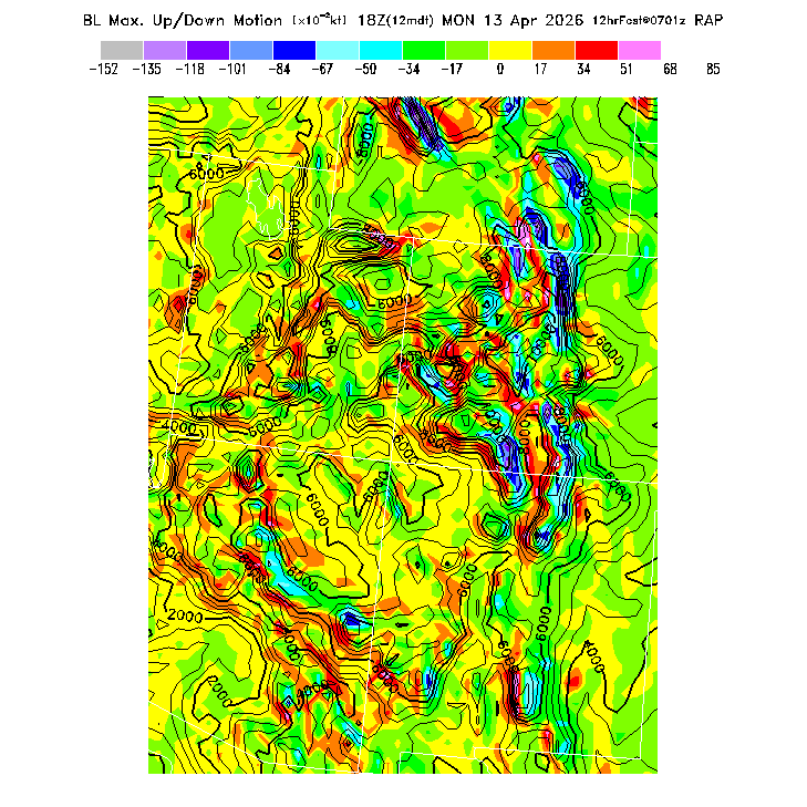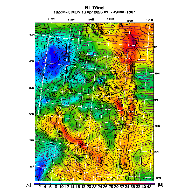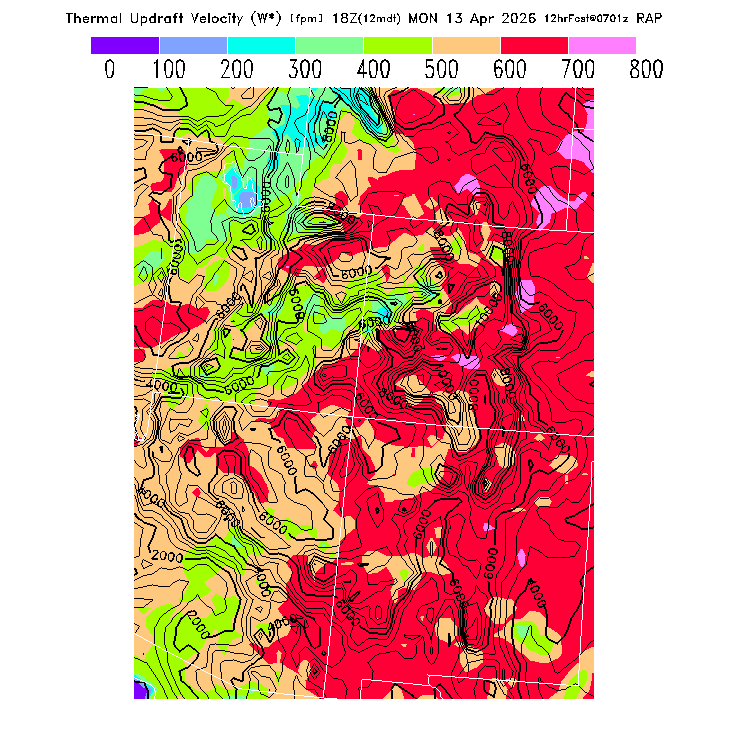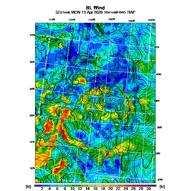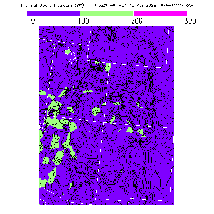 State outlines are depicted on each BLIPMAP in white.  The RAP topography is plotted as black contours, at 500 ft intervals with thicker lines at 2000 ft intervals, to assist in location identification but also to emphasize the smoothed nature of the model topography.  The BLIPMAP does not predict thermal lift created by small-scale terrain features which are not resolved by the model topography, which often give localized updrafts significantly stronger than those over the surrounding smoother terrain.  Maps of location identifiers and additional topography information for this region are available at the SW Grid Orientation webpage.