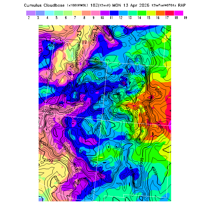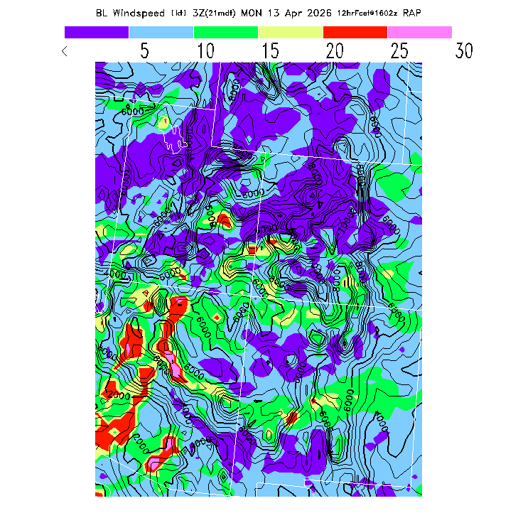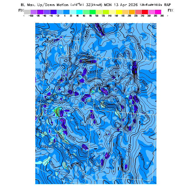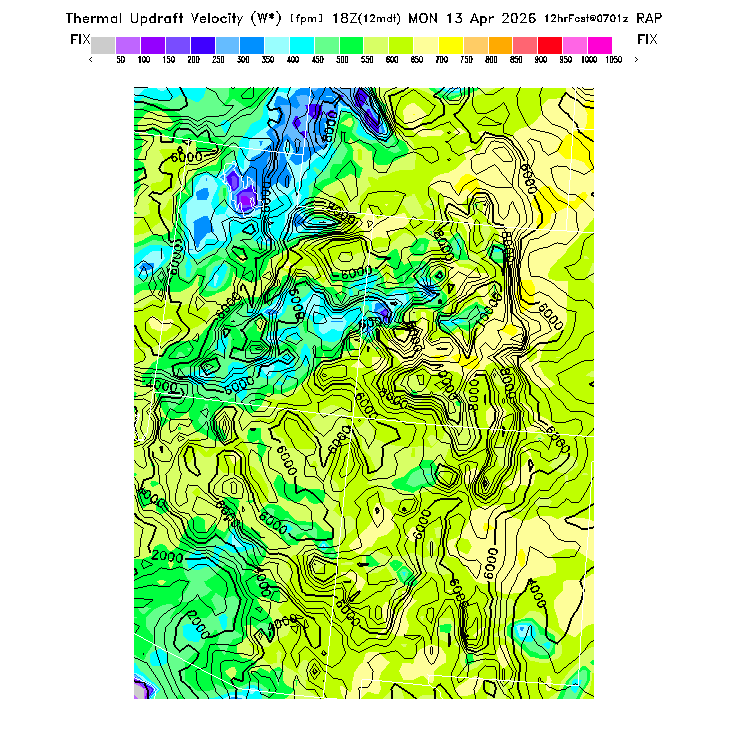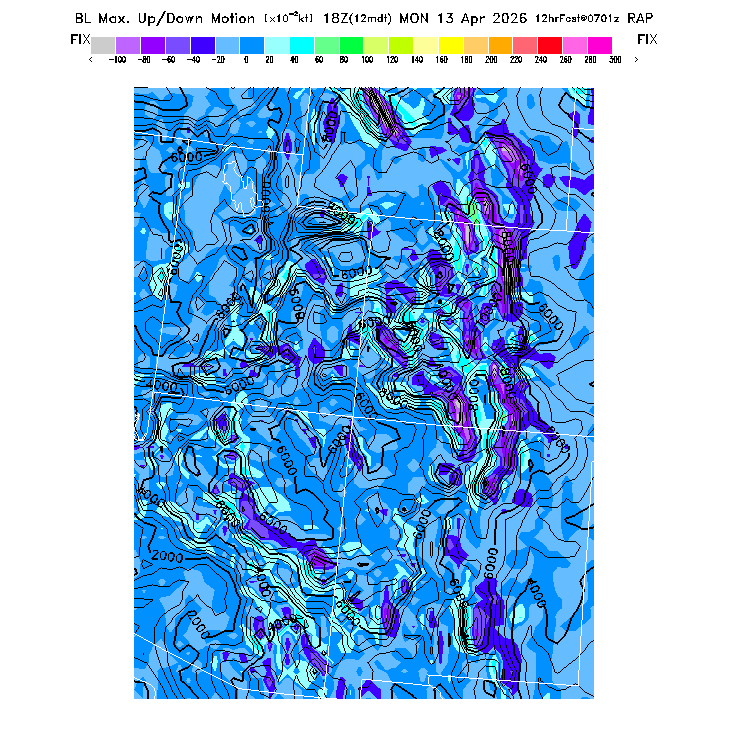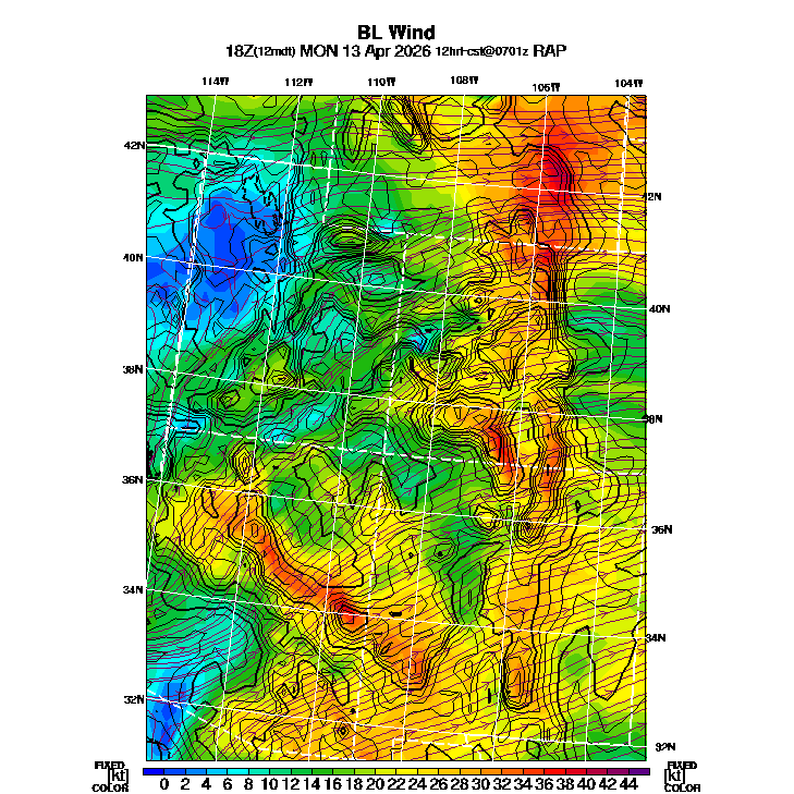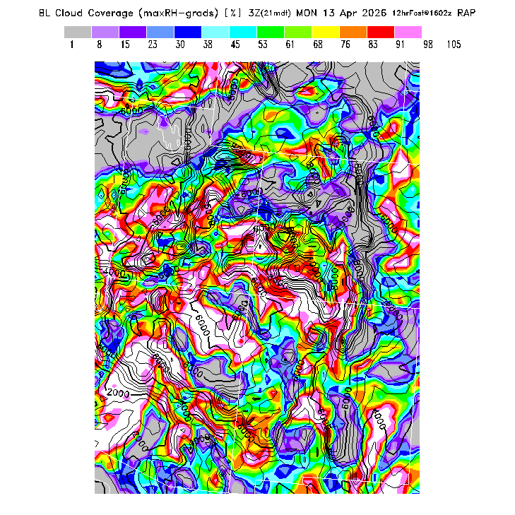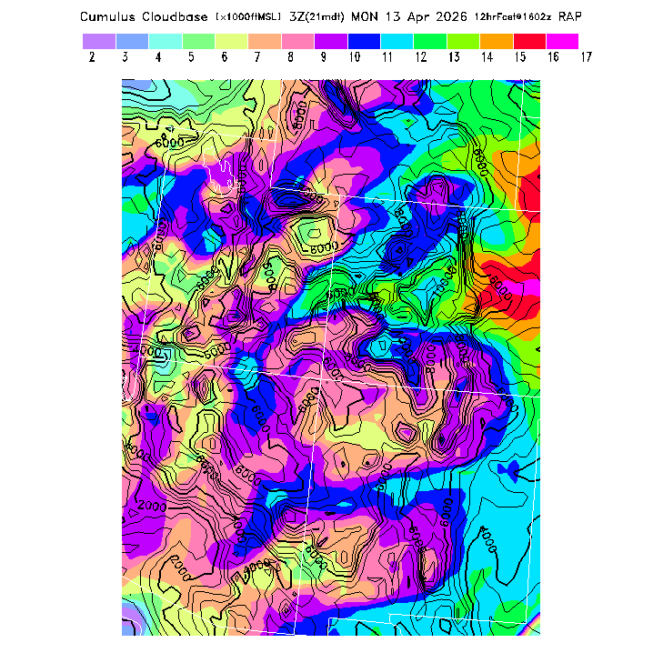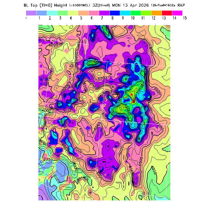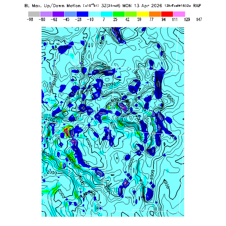 State outlines are depicted on each BLIPMAP in white.  The RAP topography is plotted as black contours, at 500 ft intervals with thicker lines at 2000 ft intervals, to assist in location identification but also to emphasize the smoothed nature of the model topography.  The BLIPMAP does not predict thermal lift created by small-scale terrain features which are not resolved by the model topography, which often give localized updrafts significantly stronger than those over the surrounding smoother terrain.  Maps of location identifiers and additional topography information for this region are available at the SW Grid Orientation webpage.