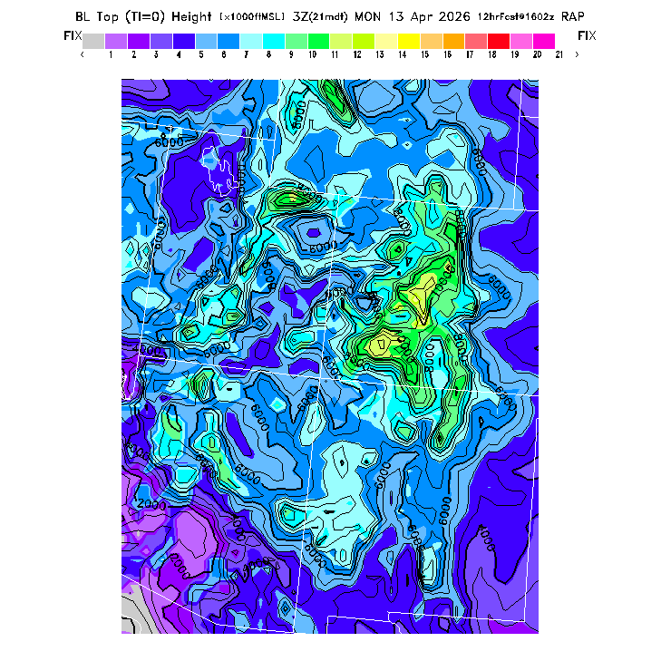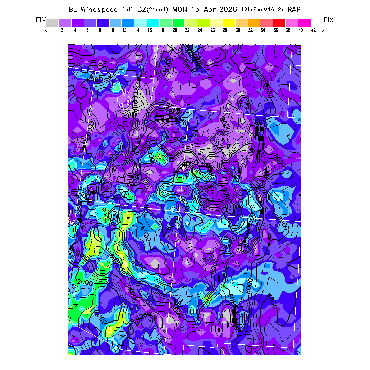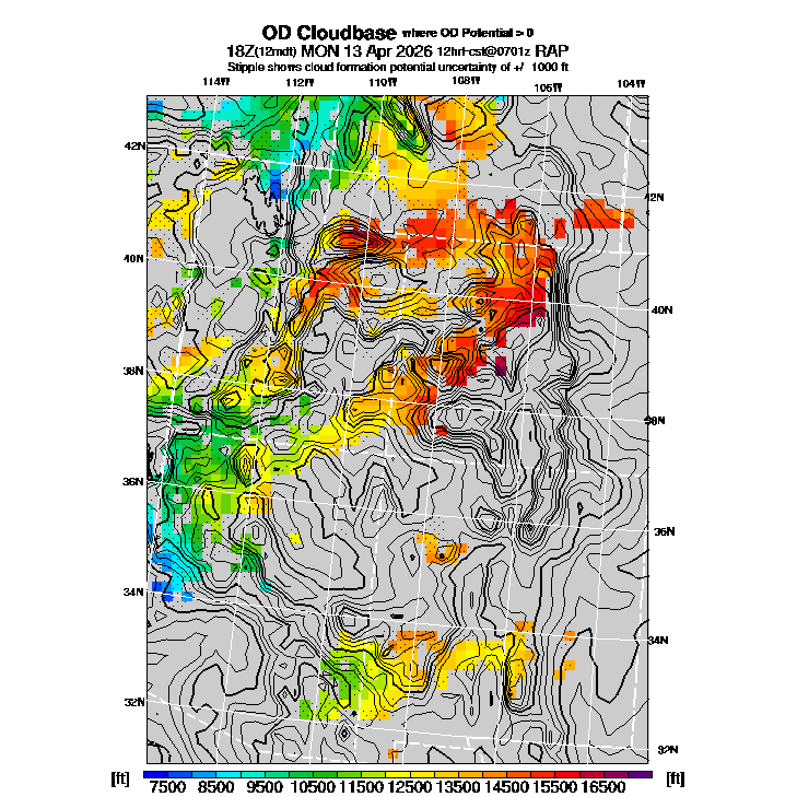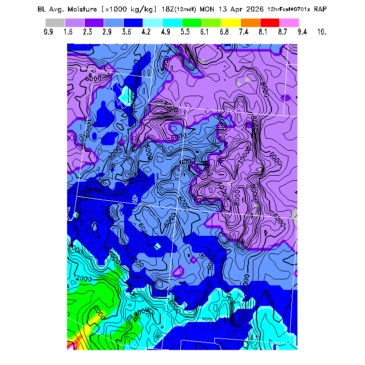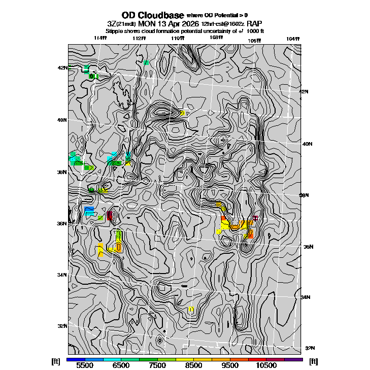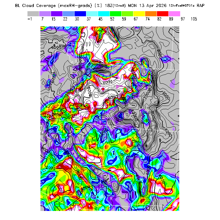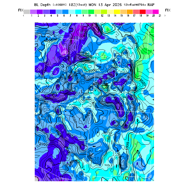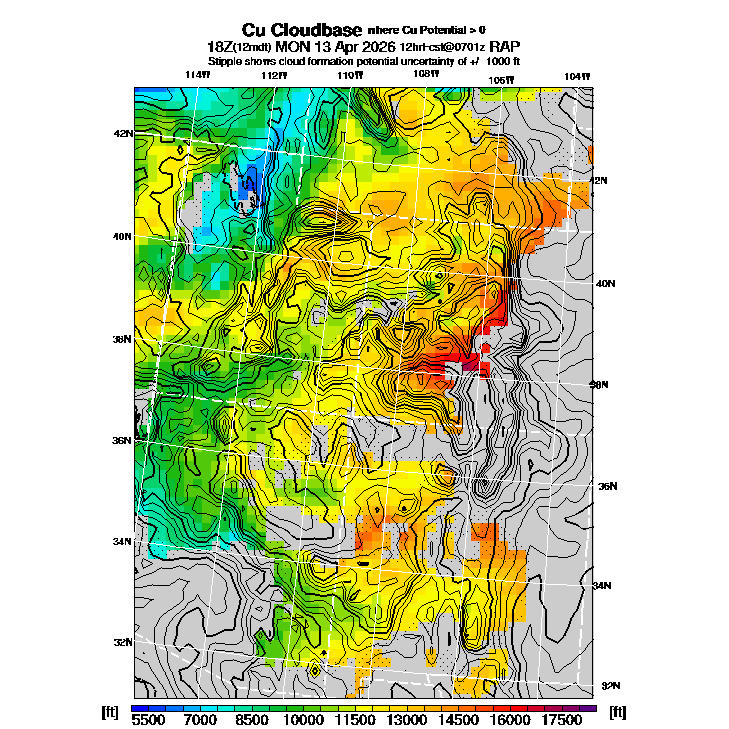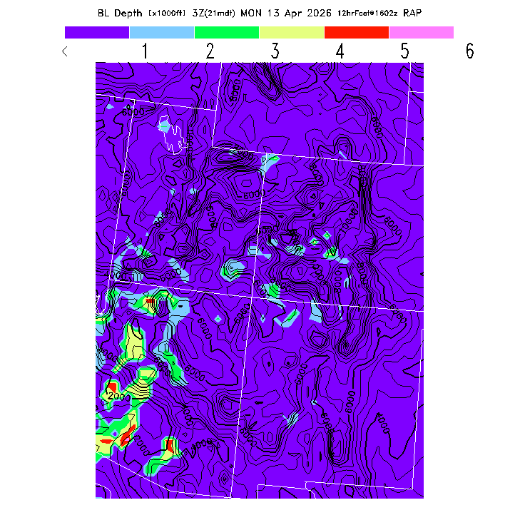 State outlines are depicted on each BLIPMAP in white.  The RAP topography is plotted as black contours, at 500 ft intervals with thicker lines at 2000 ft intervals, to assist in location identification but also to emphasize the smoothed nature of the model topography.  The BLIPMAP does not predict thermal lift created by small-scale terrain features which are not resolved by the model topography, which often give localized updrafts significantly stronger than those over the surrounding smoother terrain.  Maps of location identifiers and additional topography information for this region are available at the SW Grid Orientation webpage.