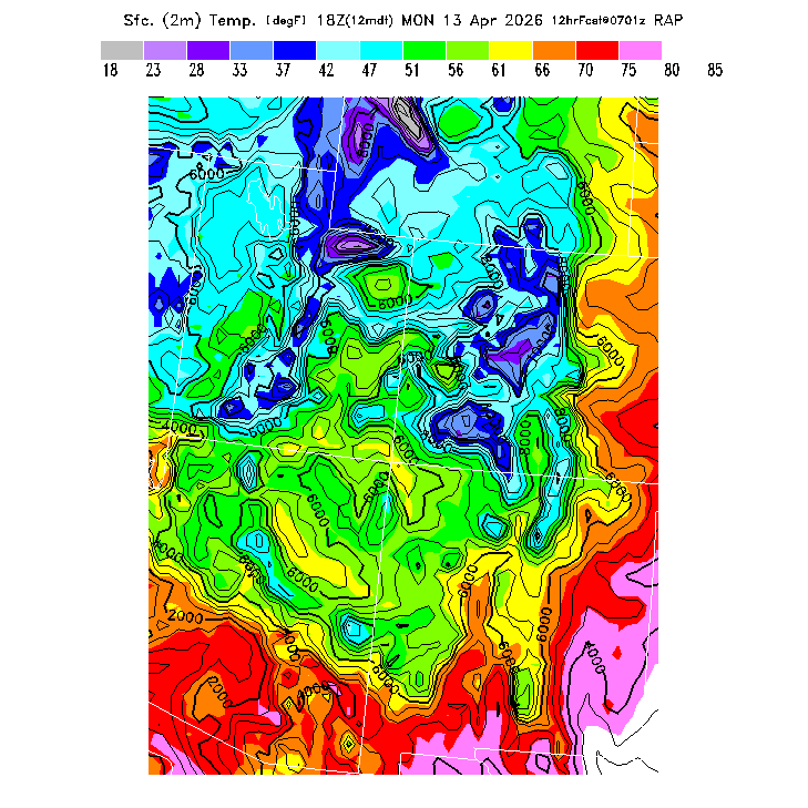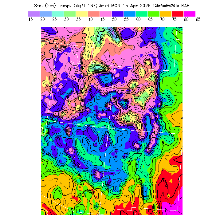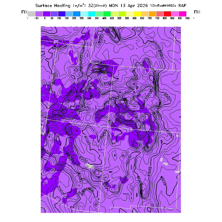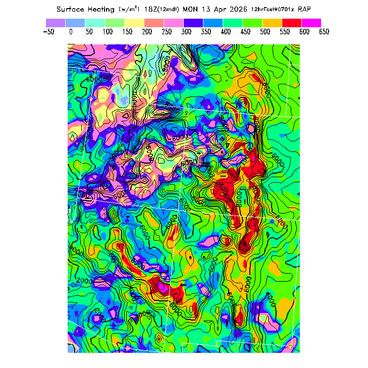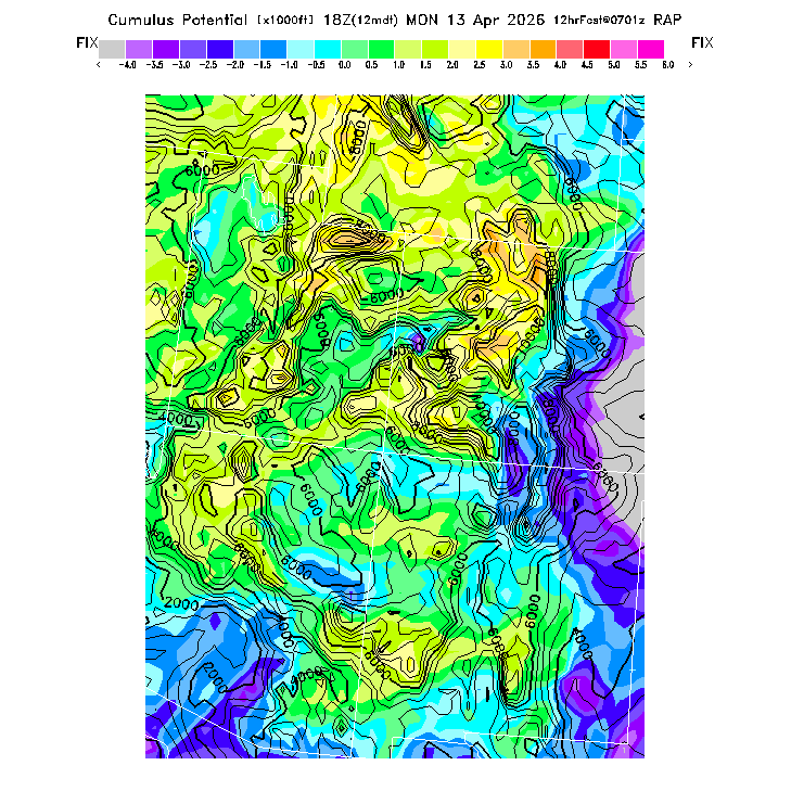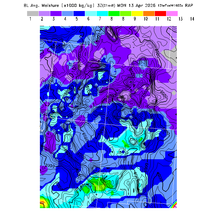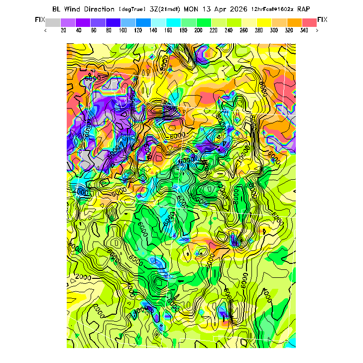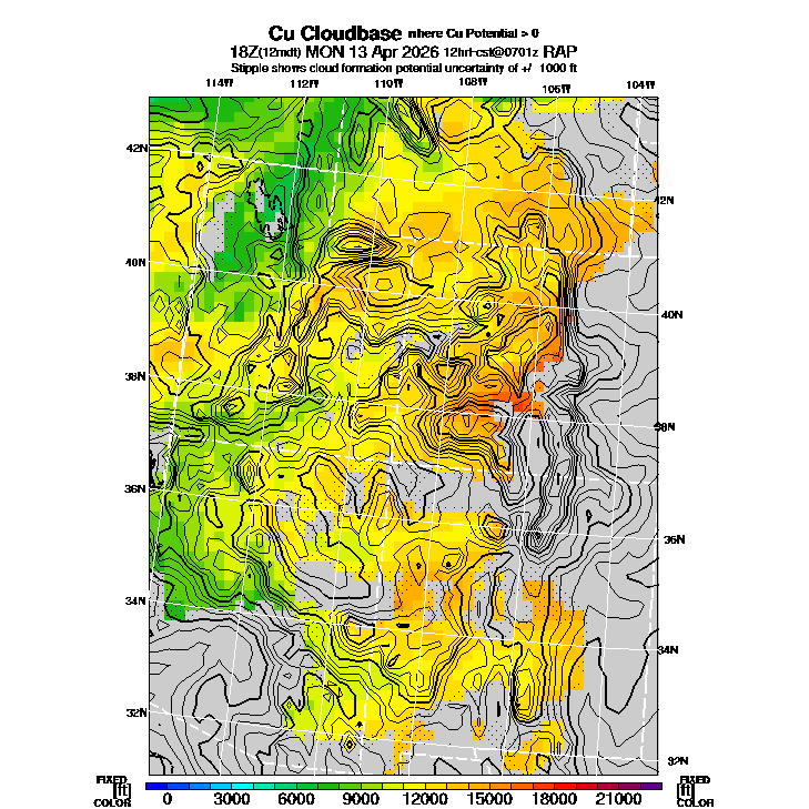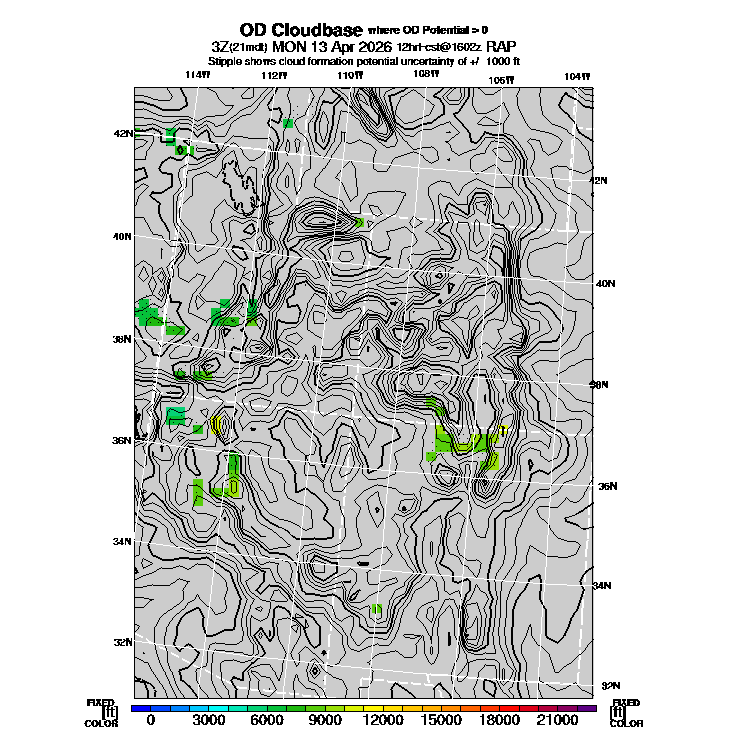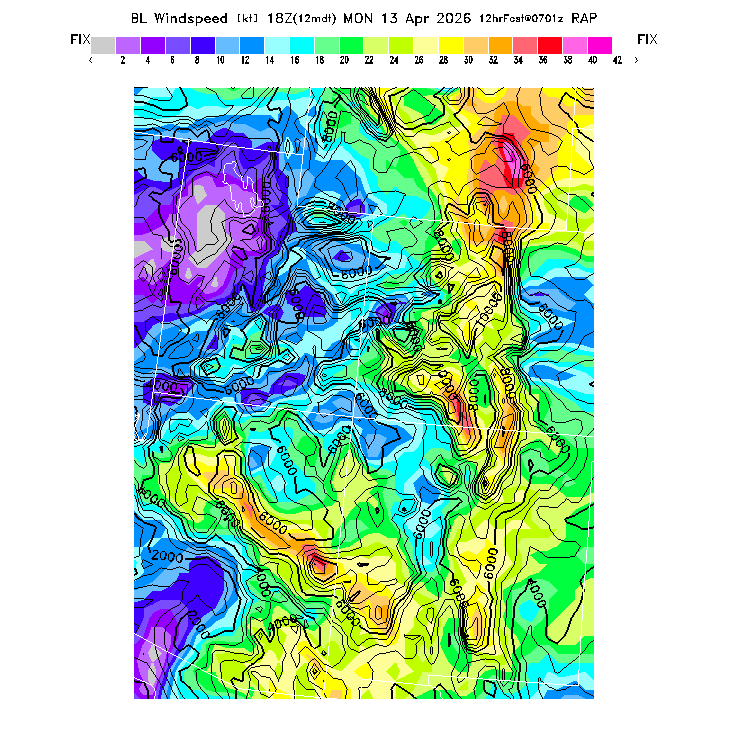 State outlines are depicted on each BLIPMAP in white.  The RAP topography is plotted as black contours, at 500 ft intervals with thicker lines at 2000 ft intervals, to assist in location identification but also to emphasize the smoothed nature of the model topography.  The BLIPMAP does not predict thermal lift created by small-scale terrain features which are not resolved by the model topography, which often give localized updrafts significantly stronger than those over the surrounding smoother terrain.  Maps of location identifiers and additional topography information for this region are available at the SW Grid Orientation webpage.