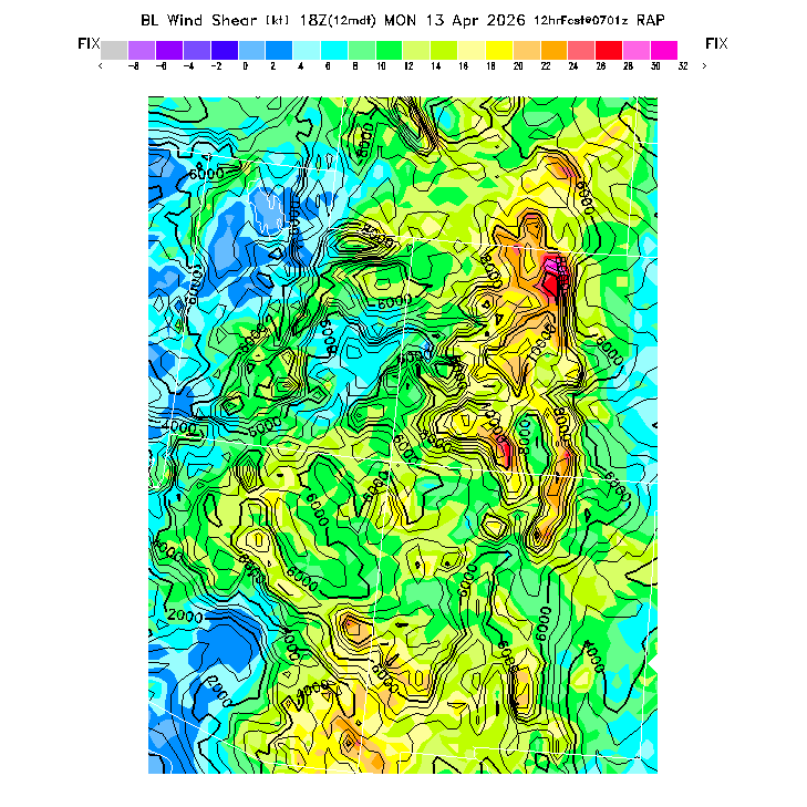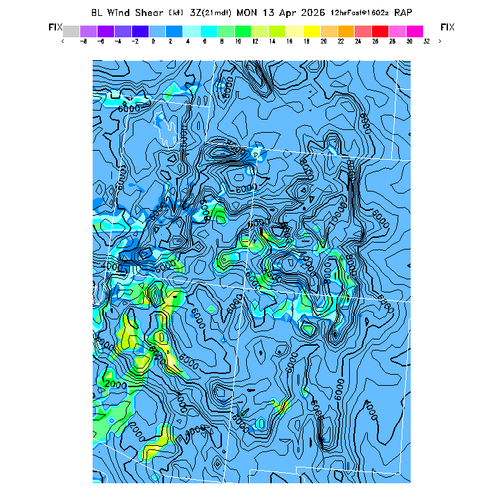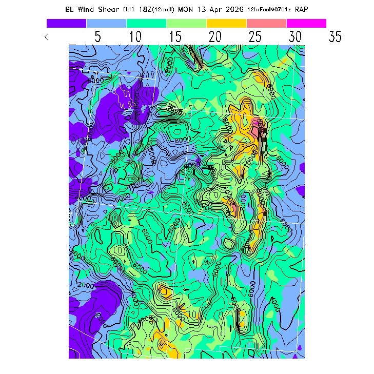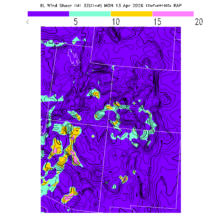 The magnitude of the vector wind difference between the top and bottom of the BL.  Note that this represents vertical wind shear and does not indicate "shear lines" (which are horizontal changes of wind speed/direction).  MoreInfo