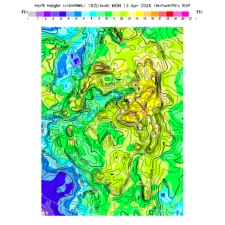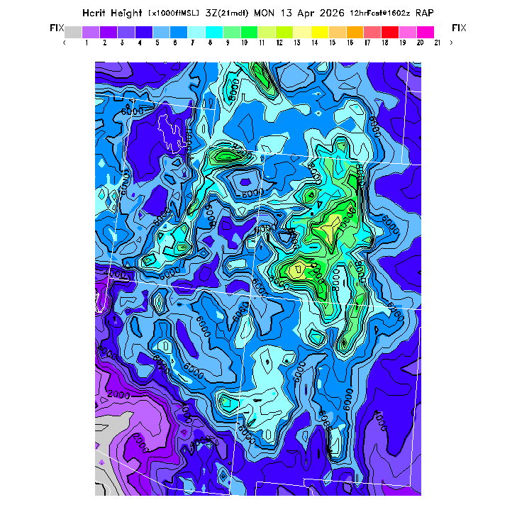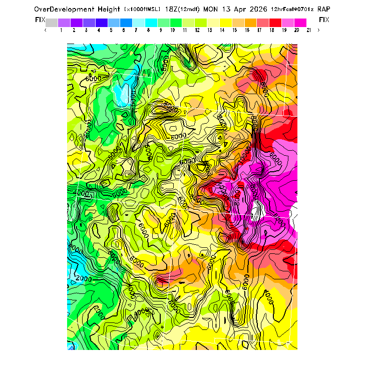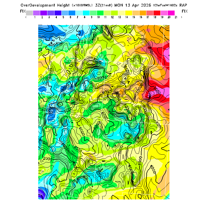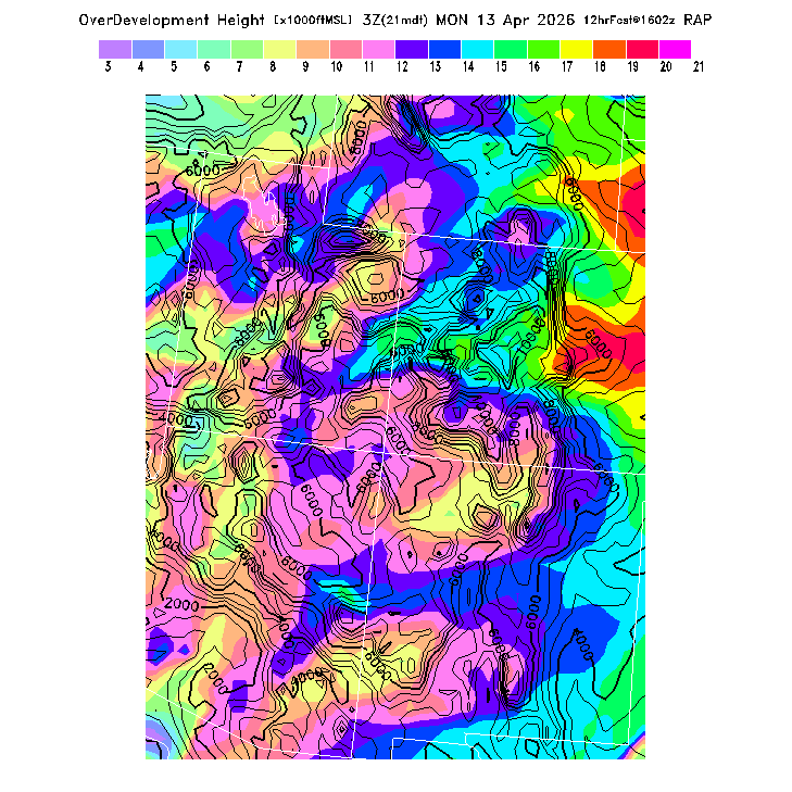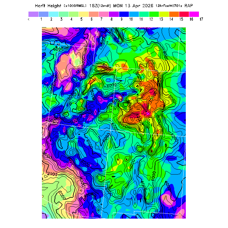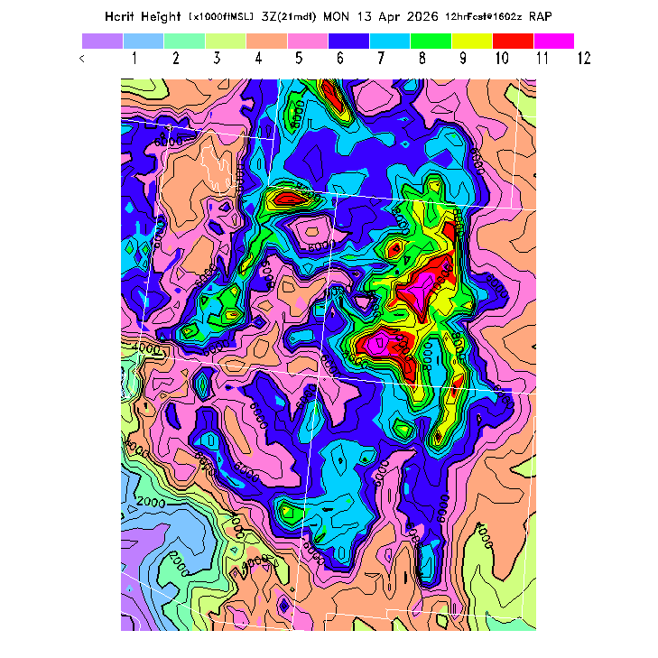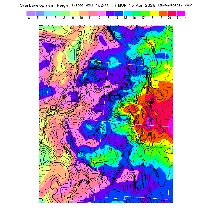 Height of the average dry thermal tops, or Thermal Index TI=0 height.  Over flat terrain maximum thermalling heights will be lower due to the glider descent rate and other factors.  However, thermal tops will be higher over small-scale topography not resolved by the model and some pilots have reported that in elevated terrain the heights they can reach over local terrain features correspond better with the TI=0 height than with Hcrit.  In the presence of clouds the thermal top will increase, but the maximum thermalling height will then be limited by the cloud base (see the "Cloud prediction parameters" section below).  [This parameter is truncated at 22,000 for plotting.]   MoreInfo