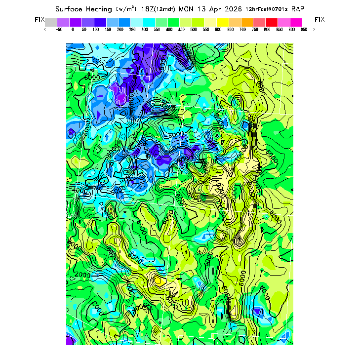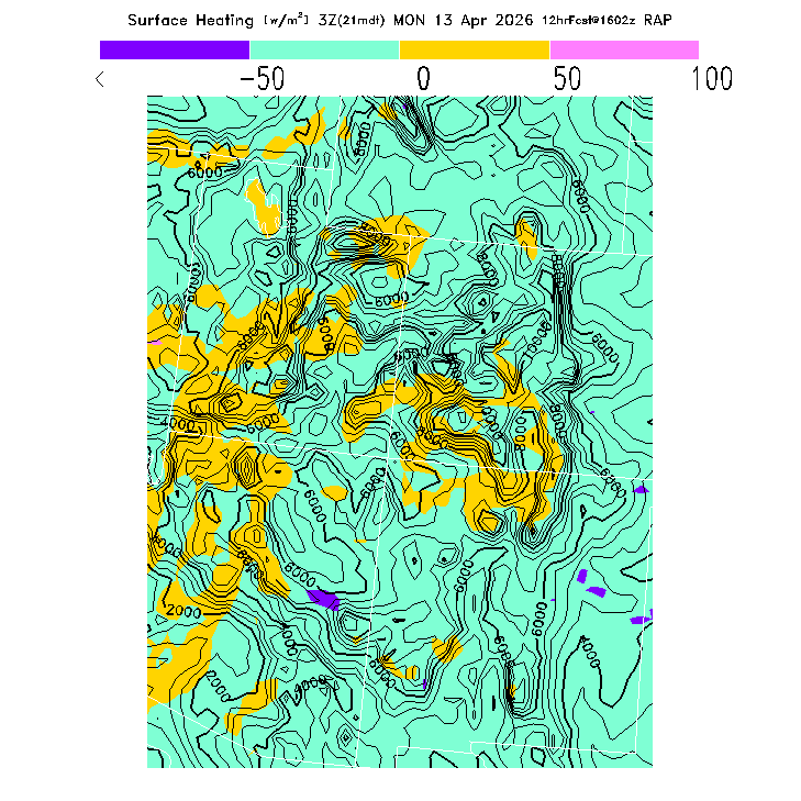 BLIPMAPs predict thermal soaring conditions resulting from surface heating of the Boundary Layer (BL), the scientific term for the turbulent atmospheric region mixed by surface-based thermals (so thermal tops occur at the top of the BL).  The BLIPMAP program post-processes numerical weather model predictions to provide parameters suited to the needs of soaring pilots and presents them in graphical format, as in this sample BLIPMAP.  Relative differences, both in location and in time, are expected to be more reliable indicators of soaring differences than are the precise numerical values.  BASIC thermal forecast parameters gives a short list of the parameters most important for thermal soaring.