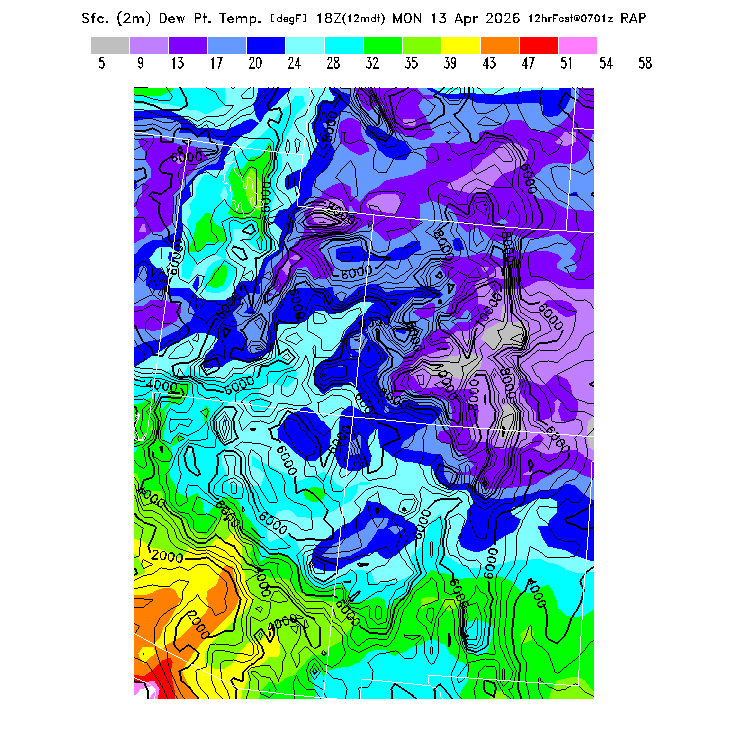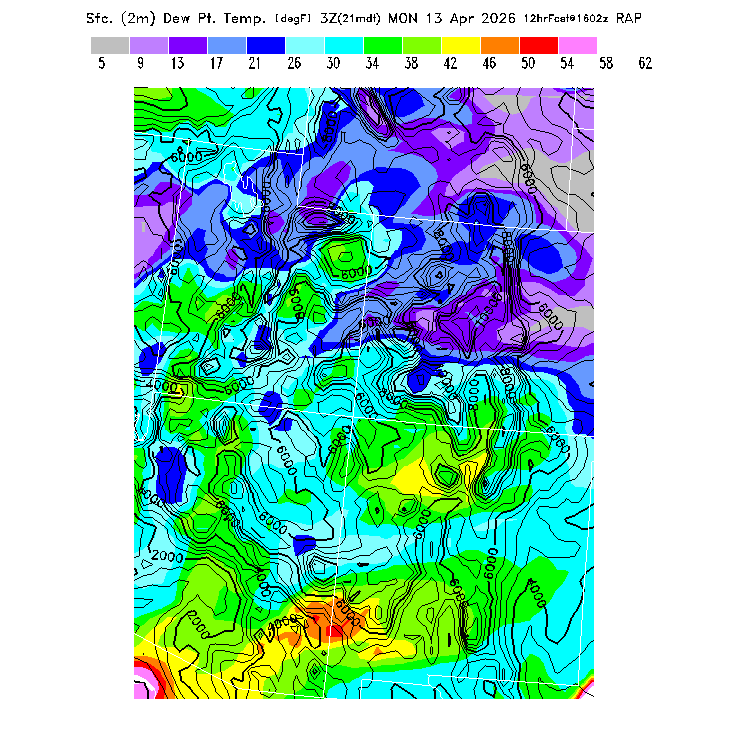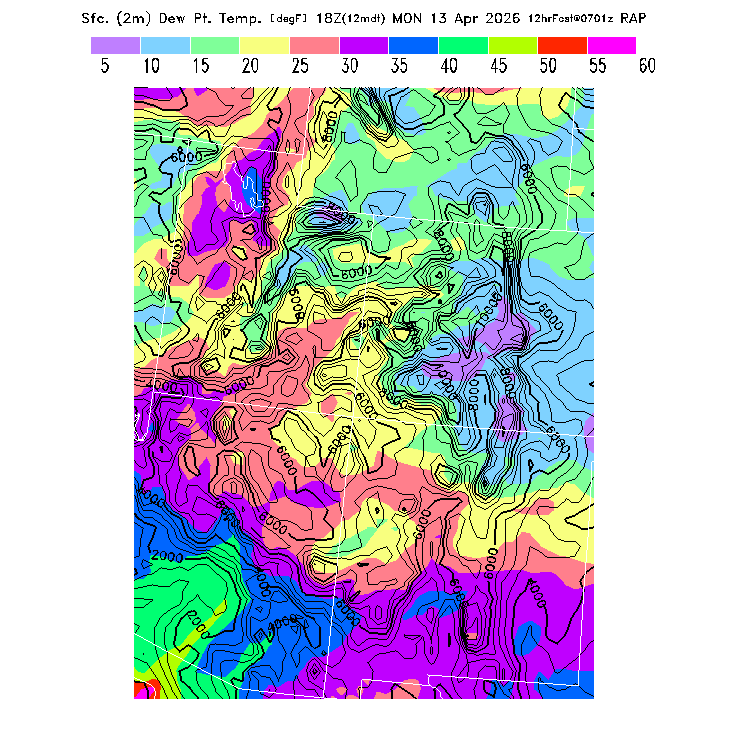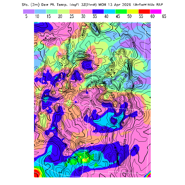 This model-predicted surface dew point temperature can be compared to the actual dew point temperature at 2m during the day to evaluate the accuracy of model moisture predictions.  MoreInfo
