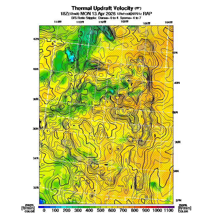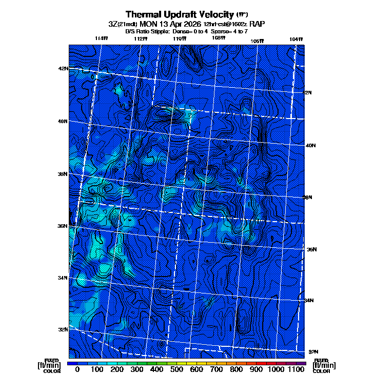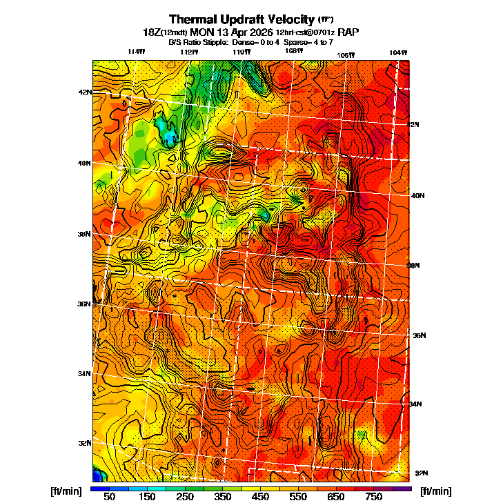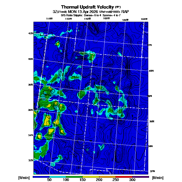 B/S Ratio stippling (dense=0-4 sparse=4-7) overlays Thermal Updraft Velocity contours to indicate where strong thermals can be broken by vertical wind shear.  See "Thermal Updraft Velocity" and "Buoyancy/Shear Ratio" parameter descriptions below for more information.