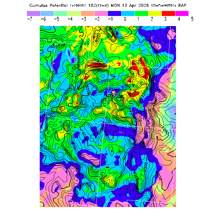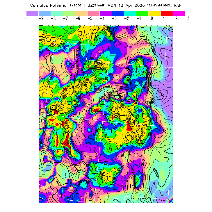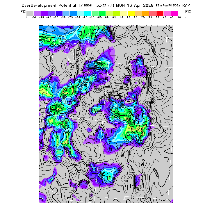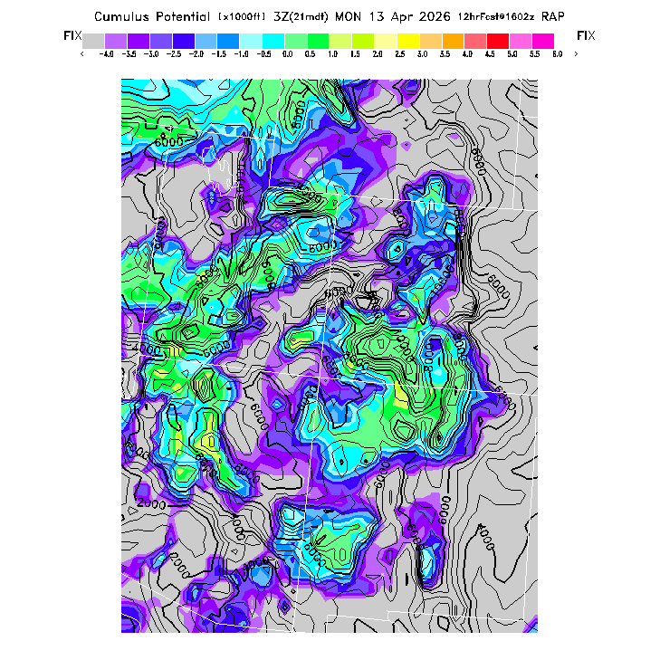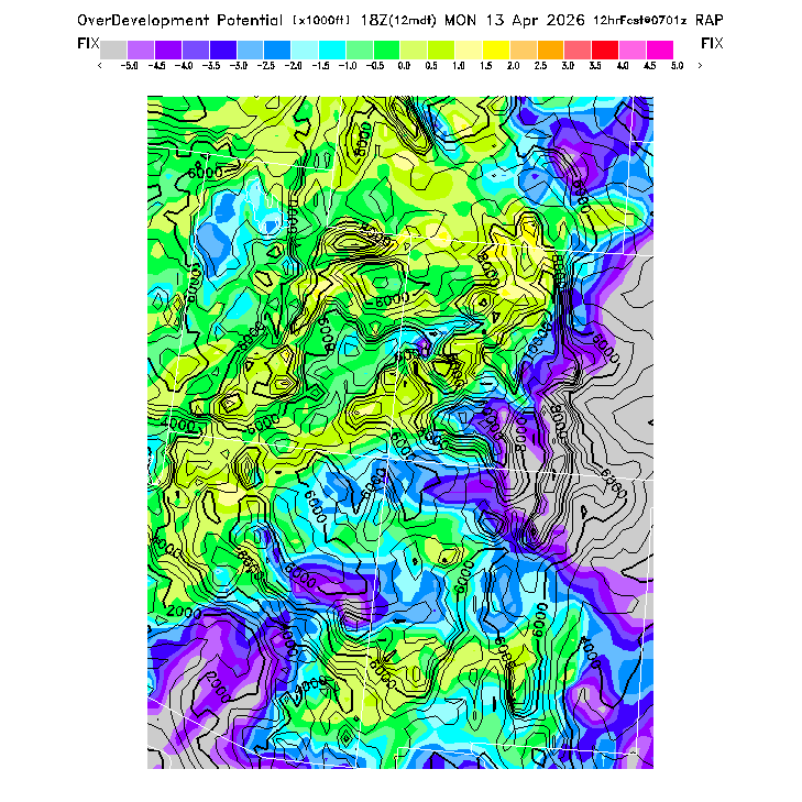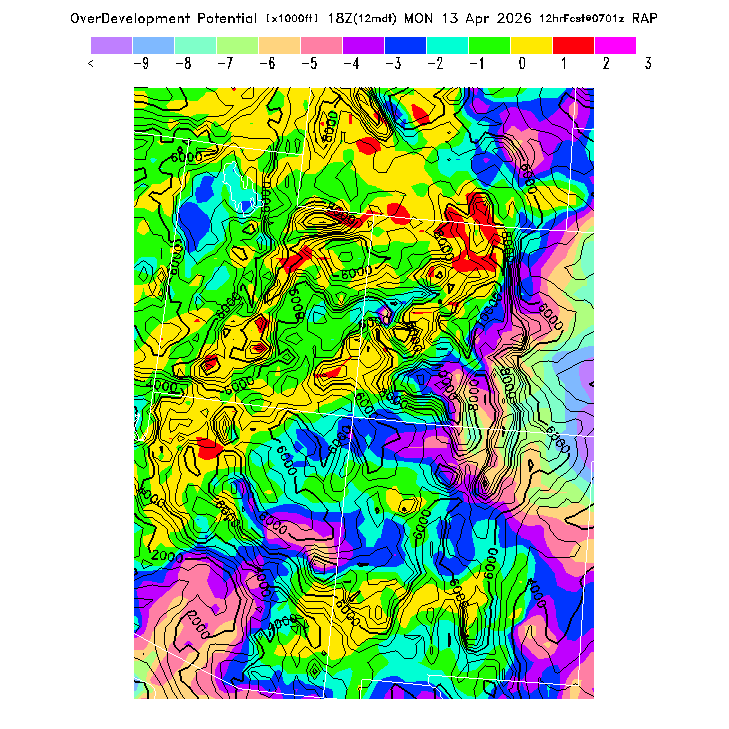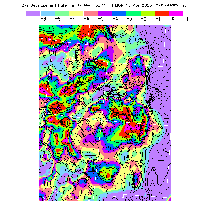 This evaluates the potential for extensive cloud formation (OvercastDevelopment) at the BL top, being the height difference between the BL CL (see below) and the BL top.  Extensive clouds and likely OvercastDevelopment are predicted when the parameter is positive, with OvercastDevelopment being increasingly more likely with higher positive values.  OvercastDevelopment can also occur with negative values if the air is lifted up the indicated vertical distance by flow up a small-scale ridge not resolved by the model's smoothed topography.  [This parameter is truncated at -10,000 for plotting.]   MoreInfo