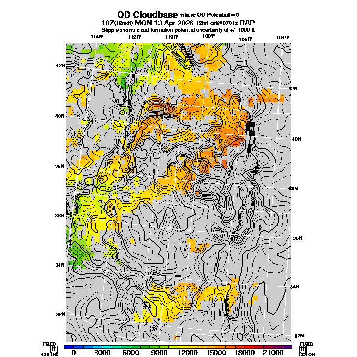 A sequence of forecasts, all for the same validation time of Multi-Time, is produced during the day as new observational data becomes available, each updated forecast having a shorter forecast period between the latest observation and validation times.  [Model initialization (observation analysis) time + Forecast Period = Validation (forecast) time]  The most important link is the first link on each line, "Latest", which gives the most recent (shortest period) forecast. The following "FirstToday" link gives the first forecast from the current day, which can be used to determine whether the model is significantly altering its predictions during the updating.  The last link, "PreviousDay", gives the last forecast from the previous day's prediction sequence, useful for those who want to compare their experiences from yesterday's flight to the RAP BLIPMAP predictions.  At the top of each forecast plot is the name of the parameter, the validation date and time, the forecast period, and the data source.